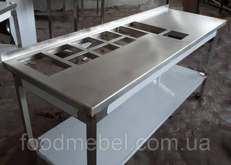 Стіл із отворами для гастроємкостей має місце під апарат шаурми або інше обладнання та робочу поверхню для приготування з гастроємками для начинки та соусів. Розміри та кількість отворів на вибір.