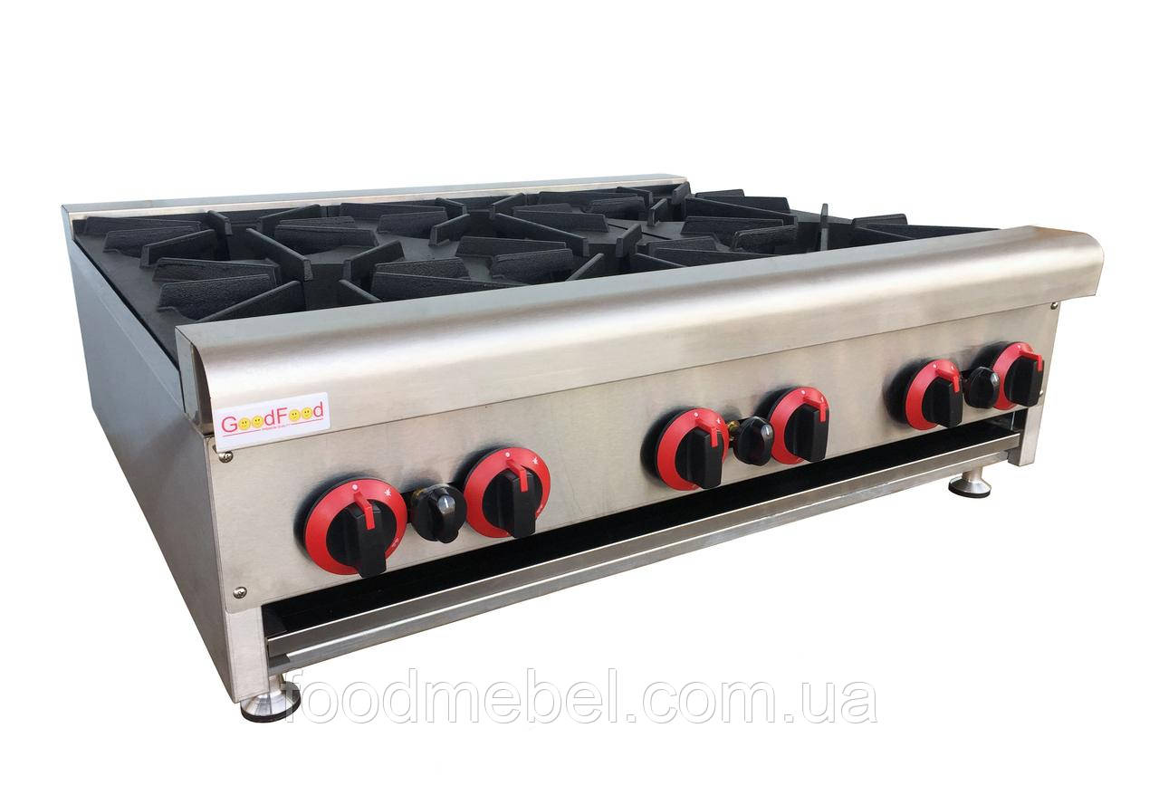 Шестиконфоркова газова плита Гудфуд GP6 має шість потужних пальників діаметром 156 мм. Витрата газу становить 1,80 м3/год.
