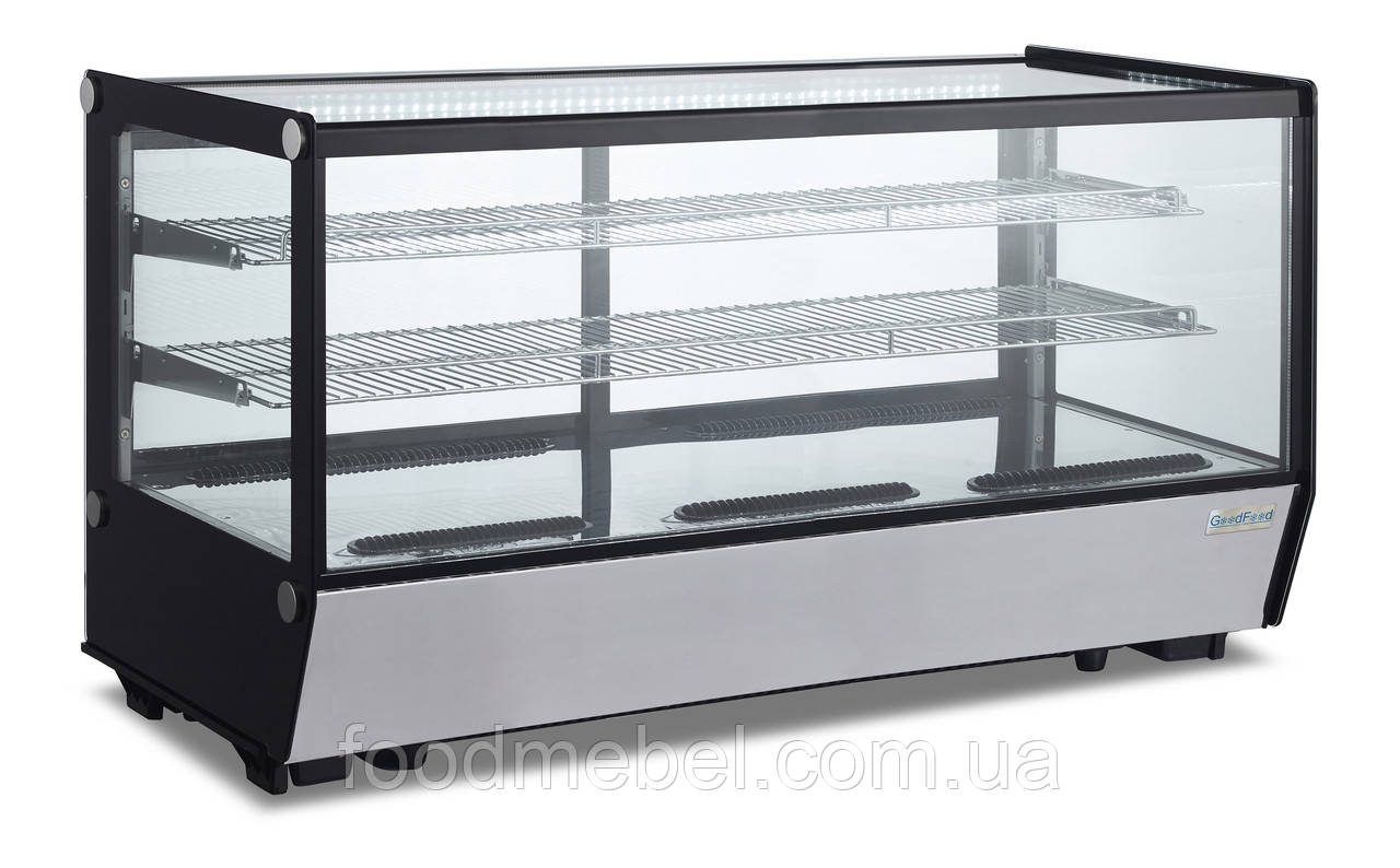 Холодильна вітрина кондитерська GoodFood RTW202L5 з прямим склом для кав'ярні та кондитерської, вітрини, бару та кафе. Корпус чорний — скло та неірж сталь зі сталевою вставкою внизу. Розсувні двері ззаду. Об'єм 200 л. Верхняя LED подсветка. Хромовані полиці. Цифрова панель керування. Температурний режим 0...+12 °C.